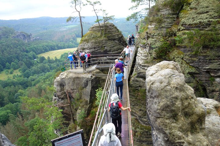 1. Bastei Bridge – Saxon Switzerland: You’ll be treated to a sweeping panoramic view that encompasses the majestic mountains and lush evergreen forests.